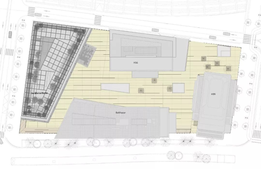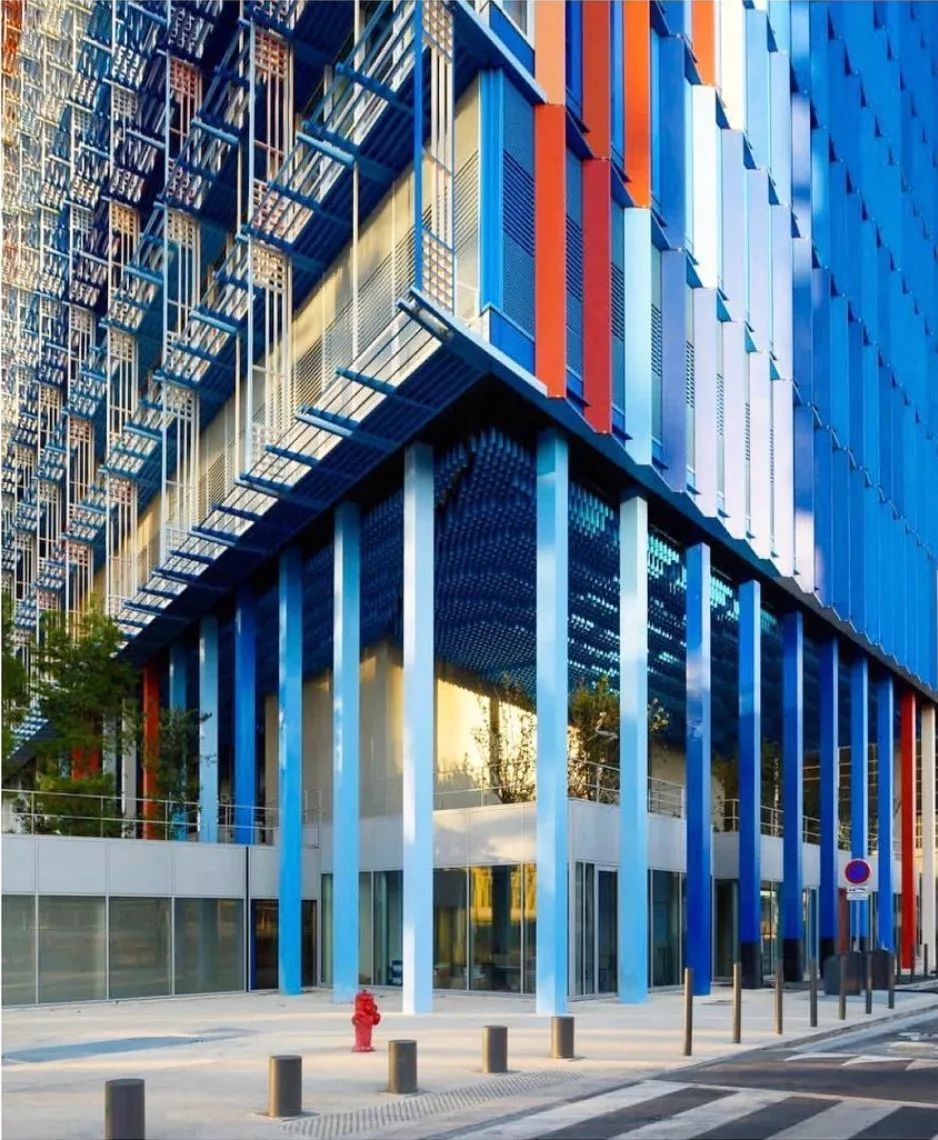 La Marseillaise 是法國國歌的名字,又名為馬賽曲,這棟大樓的外牆表皮的設計以法國國旗的顔色:紅、白、藍為主調。