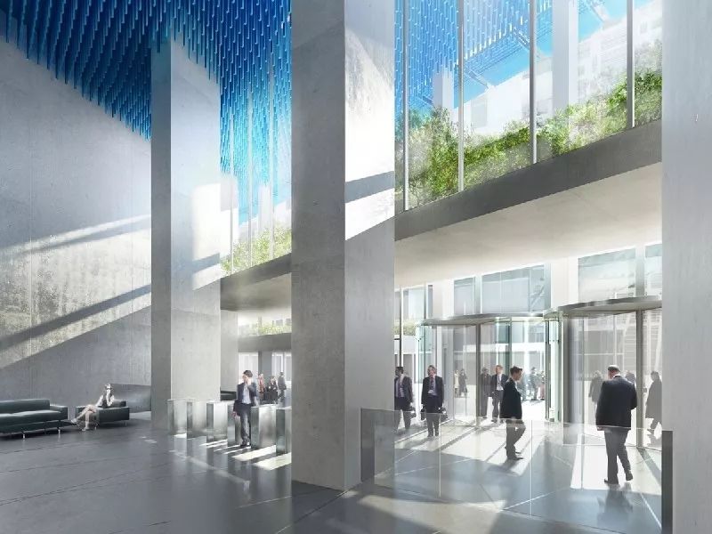 大堂的設計非常簡單,混凝土牆面、柱面和地面,用藍色線條裝飾頂部,與室外的框架相互呼應。