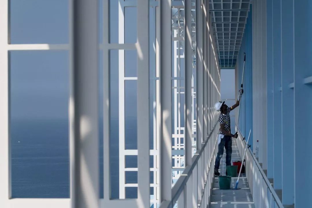 朝向海邊的一面是藍色和白色,讓建築完全融入海天一色中。