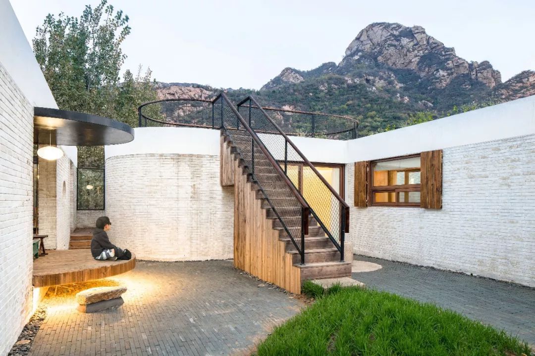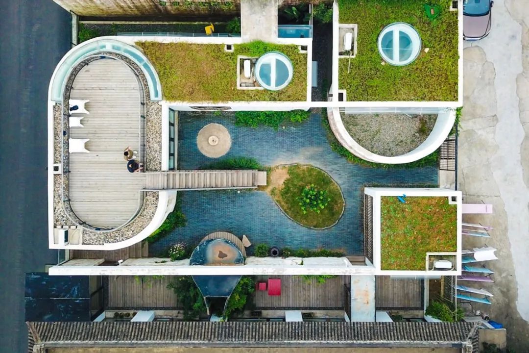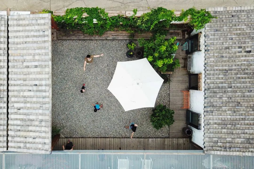 劉陽還設計了一個水滴狀的亭子,通過懸挑結構,探到院子裡。并且在亭子的北側,種植了很多爬藤植物,它們順着亭子一直長到屋頂,陽光好的時候,就會出現樹影婆娑的景象。