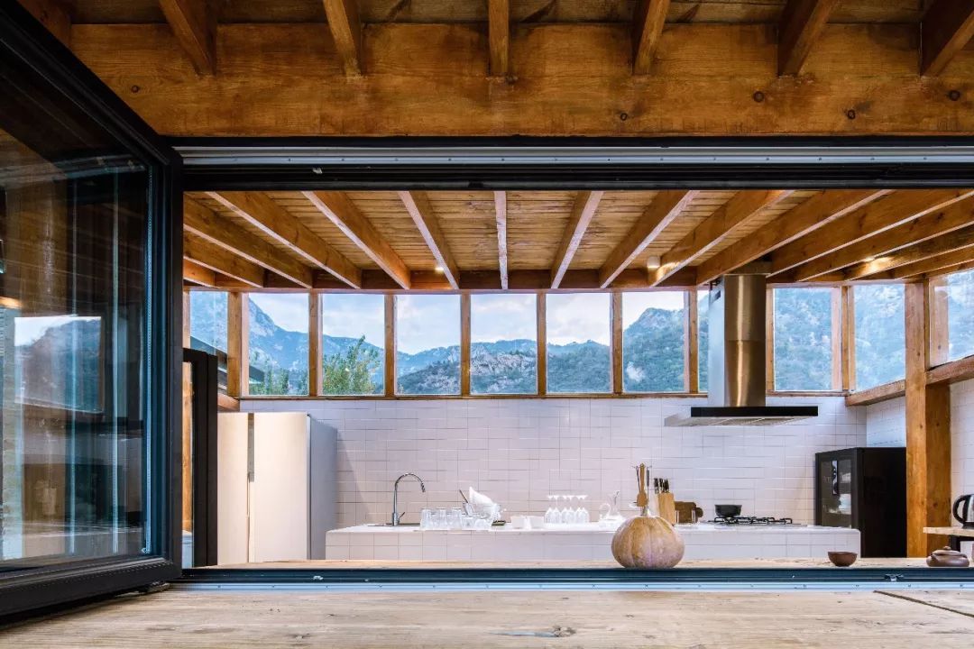 廚房的屋頂,是兩邊高、中間低的形式。其中一側朝向院子,每一扇窗戶都可以完全打開。屋頂的另一側微微翹起,對着遠山。早上,太陽從大山後面慢慢升起,透過一排玻璃高窗,照進廚房。早上在這裡為家人準備一頓早飯,是件很開心的事情。