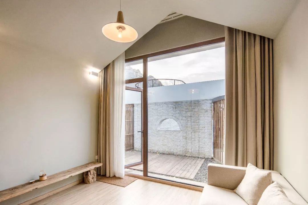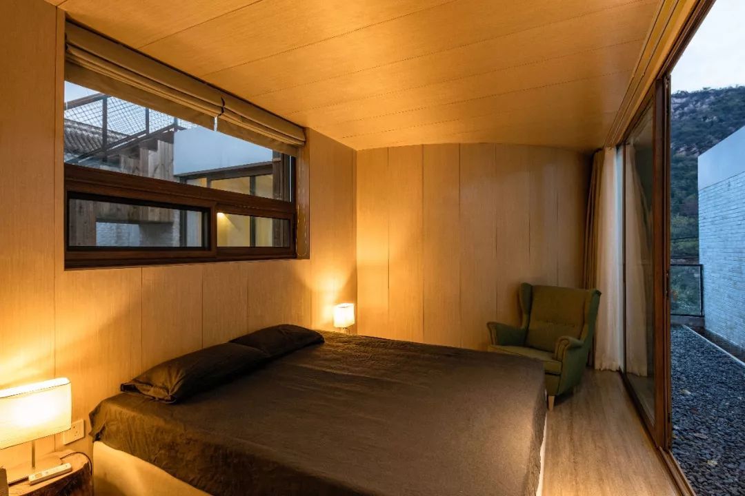 最特别的客房是一個套房,60多平米,有兩個卧室,都能看到漂亮的大山。先經過一個小院,才正式進入室内空間。與裡面客房相通的,是一個180度的懸空觀景玻璃亭,能看到山景和小溪。