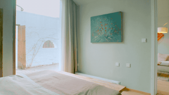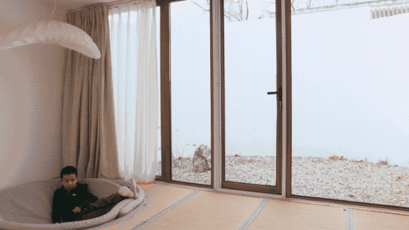 這間叫“詫”的房間,從平面上看是一個正圓形,中間有一面完全落地的玻璃幕牆,一半是室外的院子,一半是室内空間。這個房間沒有擺放一件家具,隻有一個榻榻米,适合一個人安安靜靜地住下。