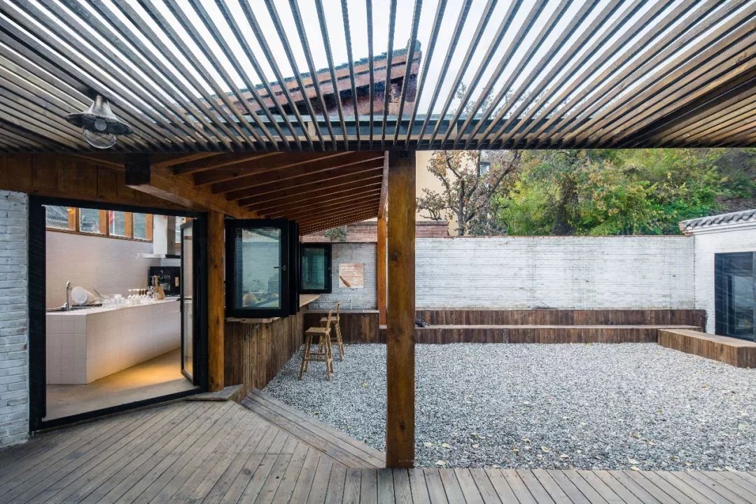餐廳位于院子的北側,房子保留了屋頂的木結構。我們将餐廳朝向院子的窗戶,全部變成了落地窗,坐在餐廳裡可以看見廚房和院子。