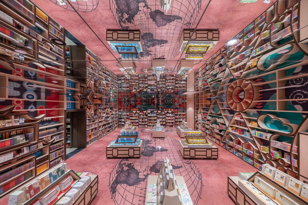 從燈造型書房走來就到了閱讀長廊,一道道門拱兩側整齊書架,在地面反射下形成一道道“穿越書海的隧道”,擺書臺仿若引領我們走向知識的盡頭。兒童館坐落在書房另一角,映入眼簾的則是五顔六色的兒童繪本區,突出了缤紛的主題,我們描繪了重慶獨有的山城景觀、建築、交通。讓小朋友在讀書的同時也可以領略到山城獨有的魅力。